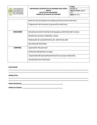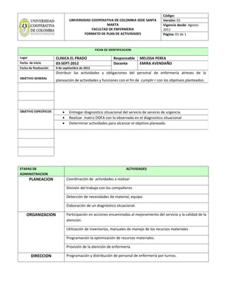 Este documento presenta el plan de actividades de Melissa Perea como responsable de la Clínica El Prado del 3 de septiembre al 9 de septiembre de 2012. El objetivo general es distribuir las actividades y obligaciones del personal de enfermería a través de la planificación. Los objetivos específicos incluyen entregar un diagnóstico situacional, realizar un análisis DOFA y determinar actividades para alcanzar los objetivos. El plan describe las etapas de planeación, organización, dirección, ejecución y control, así como las activ