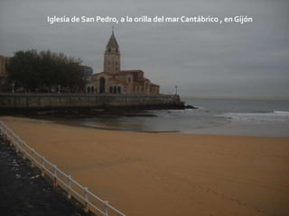 El documento presenta información sobre la ciudad de Gijón en Asturias, España. Describe algunos de los principales puntos de interés de la ciudad como la Iglesia de San Pedro, el puerto deportivo y la playa de San Lorenzo. También menciona aspectos de la gastronomía local como el marisco, la fabada y la sidra de manzana. Incluye fotografías de estos lugares, de la Universidad Laboral de Gijón y vistas de la ciudad. El autor expresa nostalgia por su ciudad natal, Gijón.