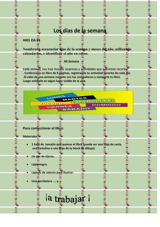 El documento proporciona instrucciones para que los estudiantes creen un libro de 8 páginas registrando su actividad favorita de cada día de la semana. Explica cómo doblar y cortar una hoja para formar el libro y luego escribir el título y pegar los días de la semana en cada página para completar las ilustraciones durante la semana. El objetivo es que los estudiantes compartan sus libros y los exhiban al final de la semana.