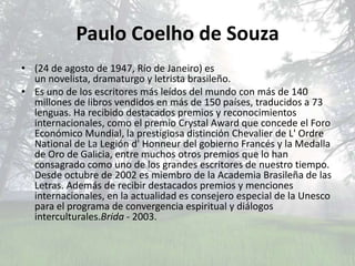 Este resumen describe a Paulo Coelho, un escritor brasileño muy leído en todo el mundo. Ha vendido más de 140 millones de libros traducidos a 73 idiomas. Uno de sus libros más famosos es Veronika Decide Morir, publicado en 1998, que cuenta la historia de una joven llamada Veronika que decide suicidarse a pesar de tener una vida aparentemente perfecta. El libro trata temas como la depresión y el suicidio y tuvo una gran repercusión.