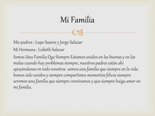 Andrés Felipe Salazar Suarez es soltero, nació en Santacruz Guachavez y vive actualmente en San Francisco con sus padres Lupe Suarez y Jorge Salazar y su hermana Lisbeth. Considera que su familia es muy unida y siempre se apoyan los unos a los otros.
