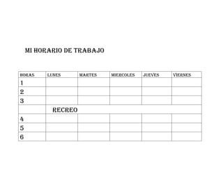 Este horario muestra las horas de trabajo de lunes a viernes, con una hora de recreo entre la tercera y cuarta hora. No se especifican las actividades realizadas en cada hora.
