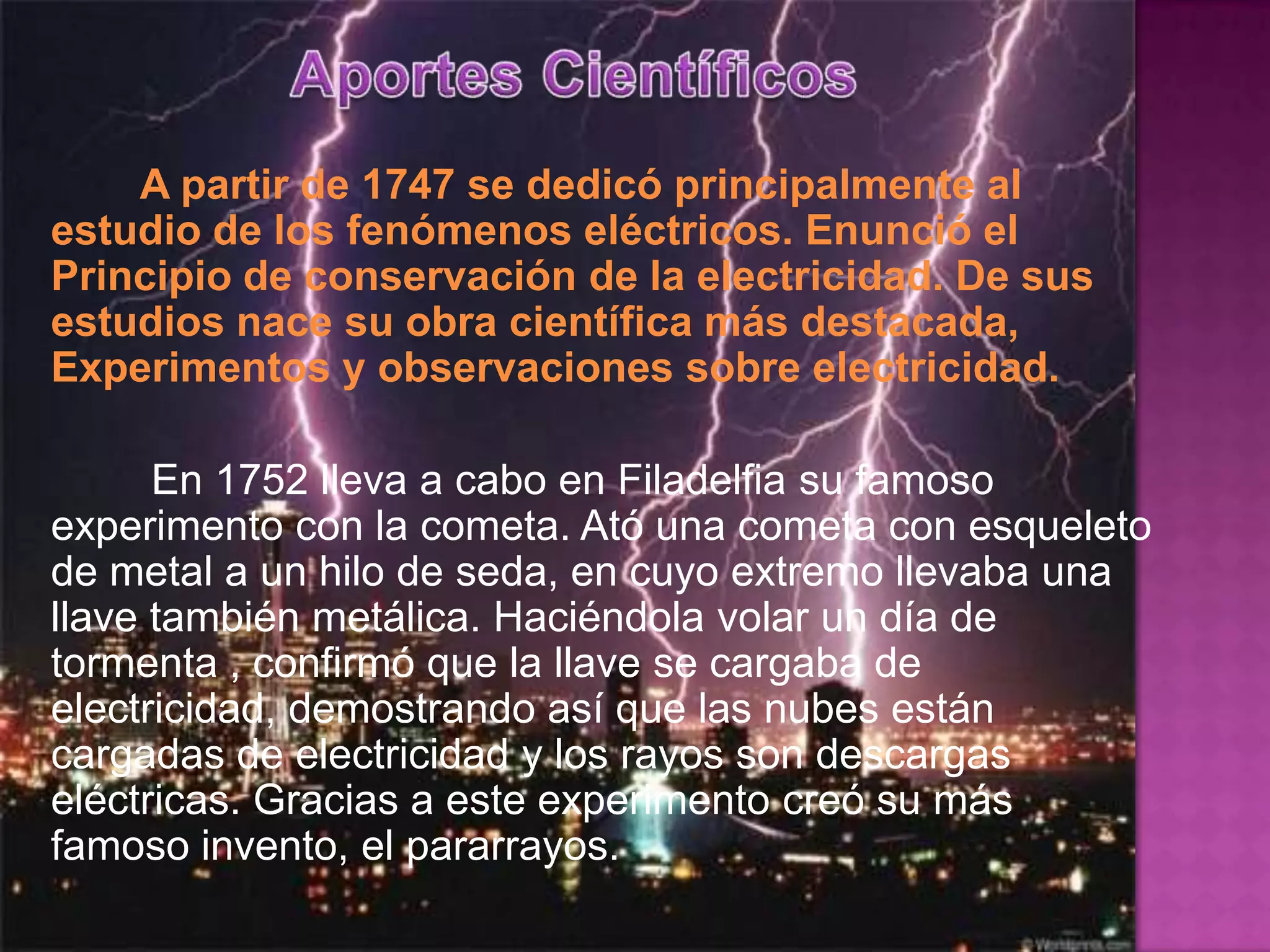 Benjamín Franklin realizó experimentos pioneros sobre la electricidad, incluyendo su famoso experimento con una cometa en 1752 que demostró que los rayos son descargas eléctricas, y propuso la teoría del fluido único para explicar los dos tipos de electricidad. Inventó el pararrayos, el horno de chimenea de Pensilvania, y otras invenciones como las lentes bifocales y el cuentakilómetros.
