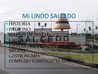 Este documento presenta información sobre el cantón San Miguel de Salcedo en Ecuador, incluyendo su historia, la iglesia de San Miguel, la laguna de Yambo, las fiestas del Príncipe San Miguel, la gastronomía local como la fritada y el hornado, y el complejo turístico El Surillal.
