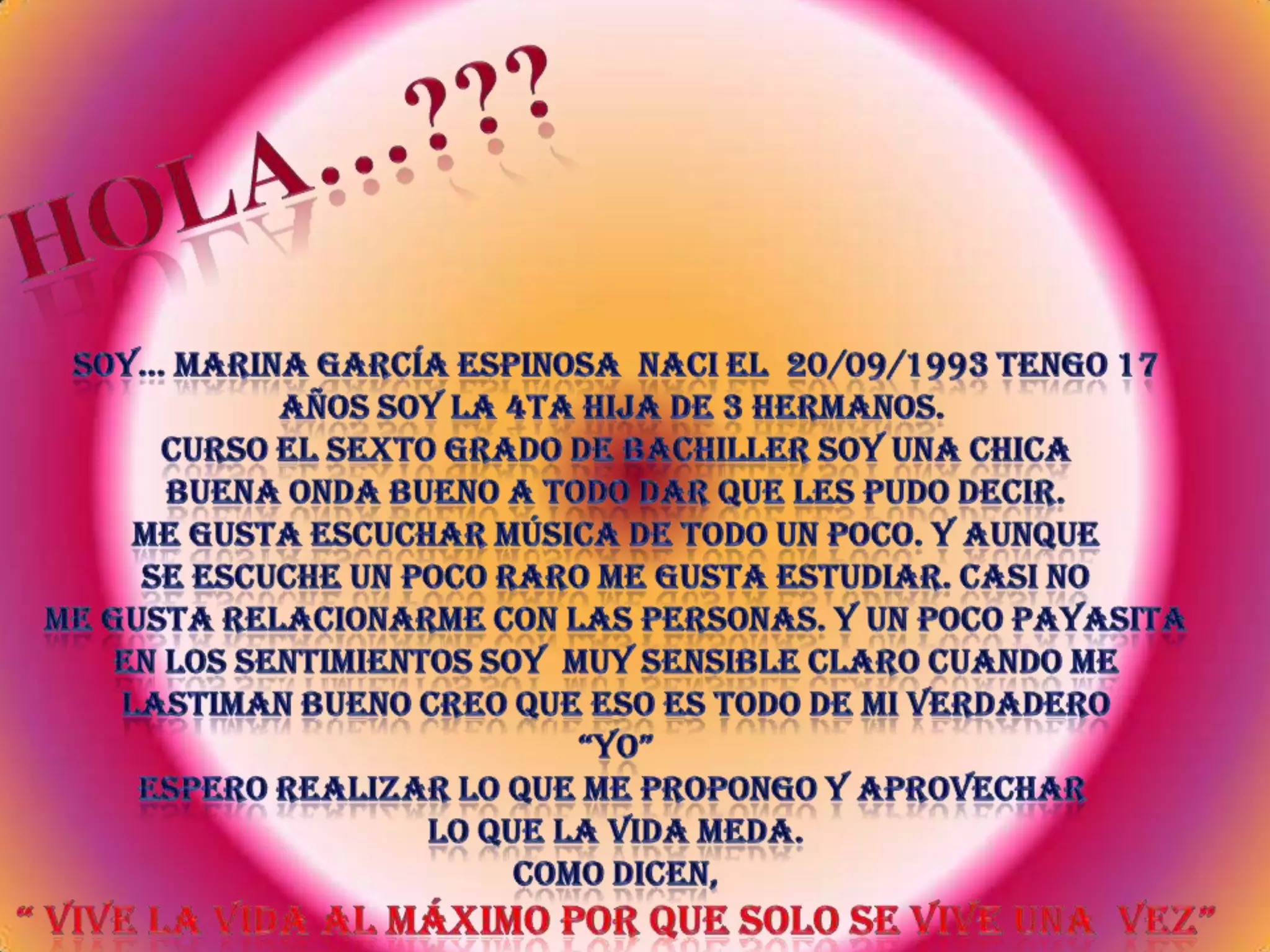 La autora se presenta como Marina García Espinosa, una chica de 17 años que cursa el sexto grado de bachillerato. Le gusta escuchar música de diferentes géneros y estudiar, aunque no le gusta relacionarse mucho con otras personas. Se describe a sí misma como sensible a las emociones cuando la lastiman. Su objetivo es aprovechar la vida al máximo y lograr sus metas.