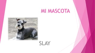 Este documento contiene información sobre la mascota del alumno llamada Slay. Se incluye información sobre la alimentación, accesorios, vacunas necesarias y edades recomendadas, vestimenta para diferentes ocasiones y climas, y una lista de las 10 razas de perros más populares con sus características.