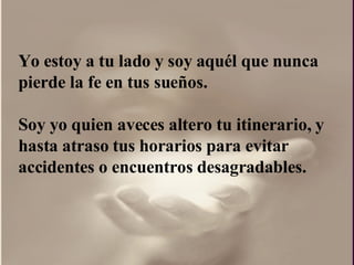 Jesús se presenta al lector y dice que siempre está a su lado, cuidándolo y guiándolo para evitar peligros. A veces altera los planes o retrasa los horarios del lector para protegerlo. Jesús también habla de las noches que pasó cuidando al lector cuando estaba enfermo y las veces que lo salvó de subir a vehículos que podrían haber tenido accidentes. Jesús lamenta cuando el lector se siente víctima o cree que los problemas son insolubles, y lo anima a ser feliz y no culpar a otros por su infelic