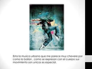 Este documento describe diferentes géneros musicales y cómo cada uno puede inspirar diferentes emociones y reacciones físicas en las personas. Se mencionan la música urbana, la música que hace recordar momentos inolvidables, el ritmo y la coordinación inspiradora de la danza, la admiración por los artistas que superan adversidades, el deseo de bailar al escuchar música con "tumbao", la emoción de escuchar pop, las ganas de bailar al escuchar merengue, la adrenalina del rock, y cómo a veces el reggaet