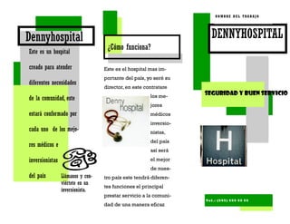 Este documento describe un nuevo hospital llamado Dennyhospital que será el más importante del país. El hospital estará conformado por los mejores médicos e inversionistas y brindará servicios de alta calidad a la comunidad de manera eficaz y segura.
