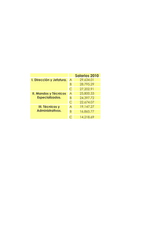 Este documento proporciona información sobre salarios de empleados en 2010, incluyendo tablas de salarios por categoría y jornada. También incluye un cuestionario interactivo para verificar si los salarios estaban de acuerdo al convenio y si se realizaron ajustes correctamente entre abril y mayo.