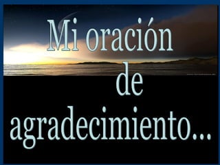 El documento es una oración de agradecimiento dirigida a Dios. En ella, la persona agradece a Dios por la vida, el amor, la naturaleza, y las alegrías y dolores experimentados. También pide perdón por el tiempo y oportunidades perdidas, y pide bendiciones de paz, alegría, sabiduría y comprensión para sí mismo, sus amigos y familiares. Finalmente, ruega llenarse de bondad para poder transmitir felicidad a los demás.