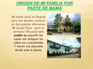 El documento describe los orígenes familiares del autor por parte de su mamá y papá. Por parte de mamá, su abuela nació en el pequeño pueblo de Jeresano, Boyacá, y su abuelo en el pueblo de Rameriquí, Boyacá, donde las casas son antiguas y se cultiva papa, maíz y arveja. Por parte de papá, su abuela y papá nacieron en Bogotá, y su abuelo en el pueblo de Pacho, Cundinamarca, que es más grande que los otros pue