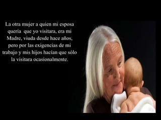 El documento narra la historia de un hombre cuya esposa le sugiere pasar más tiempo con su madre viuda. El hombre invita a cenar a su madre, quien se emociona por la invitación. Comparten una agradable velada recordando viejos tiempos. Pocos días después, la madre fallece repentinamente de un infarto. El hombre recibe luego una nota de su madre explicando que había pagado por adelantado otra cena para él y su esposa, deseando compartir más momentos juntos.