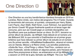 El documento resume la historia del grupo de chicos One Direction, formado en 2010 en el programa The X Factor en el Reino Unido. Describe brevemente a cada uno de los cinco miembros originales del grupo (Harry Styles, Niall Horan, Liam Payne, Louis Tomlinson y Zayn Malik), así como sus álbumes y éxitos principales. También menciona brevemente la película sobre la gira del grupo titulada This is Us y el perfume de One Direction llamado On Moment.