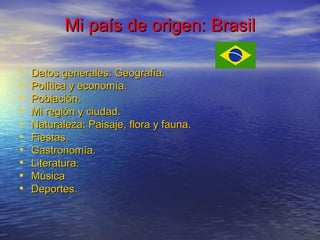 El documento describe información general sobre Brasil, incluyendo su geografía, política, economía, población, naturaleza, fiestas, gastronomía y deportes. Brasil es el país más grande de América del Sur, con una superficie de más de 8.5 millones de km2 que alberga una gran diversidad de paisajes, flora y fauna. Algunas de las tradiciones culturales más destacadas son el carnaval de Río de Janeiro y las fiestas juninas, mientras que el fútbol y la feijoada son parte importante de