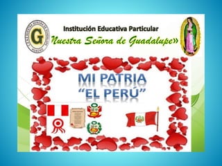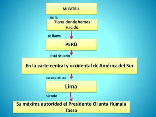 El documento describe brevemente al Perú. Ubicado en América del Sur central y occidental, el Perú limita al norte con Ecuador y Colombia, al sur con Chile, al este con Brasil y Bolivia, y al oeste con el Océano Pacífico. Su capital y ciudad más grande es Lima, y su máxima autoridad es el presidente Ollanta Humala.