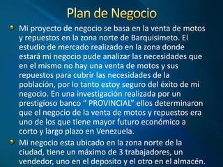 El documento describe un plan de negocio para una empresa llamada Moto Repuestos Import LA C.A. que venderá motos y repuestos en la zona norte de Barquisimeto, Venezuela. El dueño ha realizado un estudio de mercado que muestra que hay demanda insatisfecha en la zona. La empresa tendrá 3 empleados y se publicitará a través de prensa, diarios, volantes y redes sociales. El capital inicial será de 1,000,000 bs con 500,000 en financiamiento bancario.