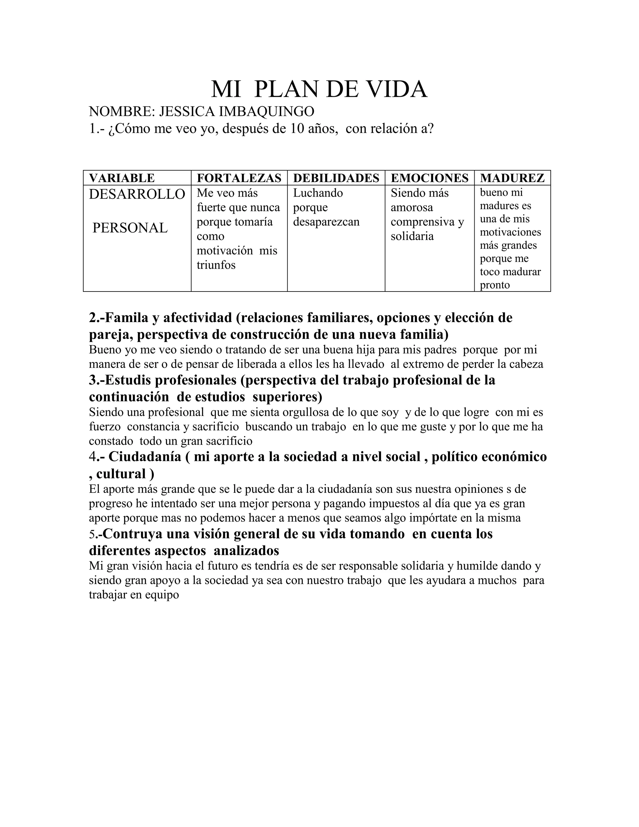 Jessica se ve a sí misma en 10 años siendo más fuerte y motivada por sus logros, siendo más amorosa, comprensiva y solidaria con los demás, y habiendo madurado de manera positiva. Ella espera ser una buena hija para sus padres y una profesional de la que se sienta orgullosa gracias a su esfuerzo, constancia y sacrificio. Su mayor aporte a la sociedad será dar su opinión para promover el progreso y pagar impuestos, trabajando en equipo para ayudar a otros. Su visión general es