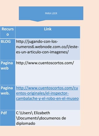 Este documento proporciona una lista de recursos educativos organizados en cuatro categorías: Para Leer, Para Hacer, Para Compartir y Para Evaluar. Incluye enlaces a blogs, páginas web, videos de YouTube y documentos PDF con contenido sobre matemáticas, lenguaje, cuentos originales y tutoriales educativos.