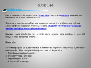 El documento presenta una serie de clases virtuales sobre el uso de herramientas digitales para la educación. En la Clase 1 se pide leer presentaciones, responder encuestas y descargar archivos. La Clase 2 habla sobre estrategias de búsqueda en internet. La Clase 3 menciona el uso de programas para marcar textos en PDF. La Clase 4 pide instalar un programa de mapas conceptuales. La Clase 5 pide crear una presentación con imágenes y enlaces.