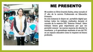 Silvia Graciela Zuleta, estudiante del profesorado en educación primaria, presenta su portafolio digital con trabajos de la materia 'entorno virtual'. A través de diversos programas como cmaptools, padlet, y webquest, aprendió a integrar TIC en la enseñanza, a pesar de las dificultades iniciales con algunas herramientas. La experiencia en esta materia la preparó para crear clases innovadoras en su futura carrera docente.