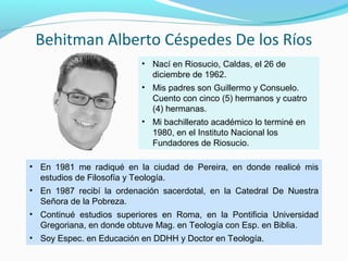 Este documento presenta a Alberto Céspedes De los Ríos, incluyendo detalles biográficos como su lugar y fecha de nacimiento, educación y cargos actuales. También proporciona una descripción general de la ciudad de Pereira, Colombia, destacando su historia, ubicación, atracciones turísticas como esculturas y monumentos, centros comerciales, sitios naturales cercanos y eventos culturales importantes como las Fiestas de la Cosecha y la Semana Santa.