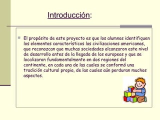 Este documento presenta un proyecto educativo sobre las grandes civilizaciones americanas (maya, azteca e inca) para estudiantes de sexto año básico. El proyecto busca que los estudiantes identifiquen los elementos característicos de estas civilizaciones y reconozcan su desarrollo cultural antes de la llegada de los europeos. Los objetivos incluyen identificar las civilizaciones, analizar su realidad social y reconocer sus sistemas político, social y cultural. Las actividades propuestas son ver videos, buscar información, trabajar en