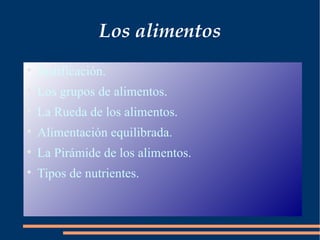 Este documento describe los principios de una alimentación saludable y equilibrada. Explica los grupos de alimentos, incluyendo cereales, frutas, verduras, carnes y productos lácteos. También describe la "Rueda de los Alimentos" que clasifica los alimentos en energéticos, protectores y constructores. Además, explica el concepto de alimentación equilibrada y presenta la "Pirámide de los Alimentos" como guía para lograr una dieta balanceada. Finalmente, resume los principales tipos de nutrientes como hidratos