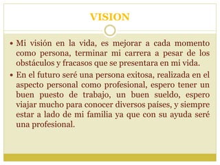 Este documento presenta la visión, misión, valores, fortalezas, oportunidades, debilidades y amenazas de Paola Fernández Ventura. Su visión es mejorar constantemente como persona, terminar su carrera a pesar de los obstáculos y ser exitosa tanto personal como profesionalmente. Su misión es cumplir sus metas y terminar su carrera con notas por encima del promedio. Sus valores principales incluyen el respeto, la humildad, la paciencia y la honestidad.