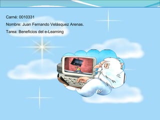 El documento describe los beneficios del e-learning, incluyendo que permite estudiar de forma flexible en cualquier momento y lugar, actualiza conocimientos de forma continua, y facilita el aprendizaje de forma menos estresante que las clases presenciales. También menciona que el e-learning es innovador al incorporar diferentes elementos multimedia, y fomenta el trabajo colaborativo entre profesores y estudiantes.