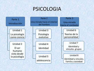 La psicología se define como la ciencia que estudia la conducta humana en función de la personalidad y el contexto social y cultural. Examina preguntas sobre la conducta humana a través de ramas como la psicofisiología, psicopatología y psicología social. La psicología evolutiva estudia el desarrollo humano a lo largo de las diferentes etapas de vida, desde el nacimiento hasta la muerte.