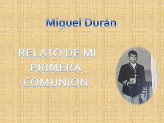 Este documento describe la experiencia de la primera comunión del autor en la década de 1960 en Huelva, España. Recibió sus primeras lecciones de lectura y escritura en la Academia de San José antes de asistir a la Academia de San Carlos para prepararse para la comunión con catecismo. El día de la comunión, el autor y sus compañeros se sentaron en las primeras filas de la iglesia y el sacerdote no los interrogó sobre el catecismo. Después de la ceremonia, el maestro invitó a los niños y sus padres