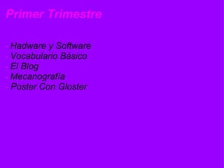 El documento presenta el plan de estudios de Verónica para el primer y segundo trimestre. Cubre temas como hardware y software, vocabulario básico, mecanografía, blogs, grafiti, comics, programación y herramientas en línea como Picnik y Google Docs.