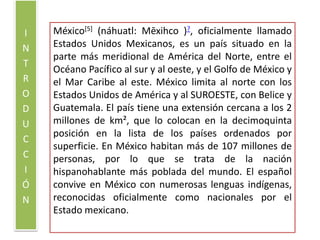 México es un país situado en América del Norte entre el Océano Pacífico y el Golfo de México. Tiene una superficie de casi 2 millones de km2 y una población de más de 107 millones de personas. El clima y la biodiversidad de México son muy diversos, con climas que van desde tropicales hasta fríos de montaña y más de 200,000 especies de plantas y animales. México es una república federal democrática compuesta por 32 estados y un distrito federal.