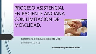 Este documento describe el proceso asistencial de una paciente anciana con limitación de movilidad. Se realizó una valoración integral que identificó problemas relacionados con la alimentación, eliminación, movilización, higiene, sueño y seguridad del entorno. Se establecieron diagnósticos y un plan de cuidados que se enfocó en prevenir infecciones, controlar la hipertensión, el dolor y el riesgo de caídas. Tras dos meses de ejecución del plan, la evaluación mostró una mejoría en los indicadores rel