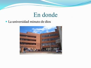 El estudiante actualmente cursa el primer semestre de Tecnología en Informática en la Universidad Minuto de Dios. Su objetivo es completar su carrera técnica y continuar estudios en Ingeniería de Sistemas. Considera que la universidad ofrece programas de alta calidad y valores acordes con sus intereses en tecnología e informática.