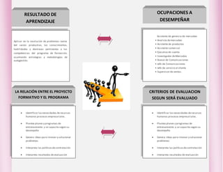 Este documento describe un programa de formación en gestión de mercados. El programa busca brindar personal calificado al sector comercio y servicios para contribuir al desarrollo económico. El programa enseña sobre planeación de mezclas de productos y servicios para satisfacer las necesidades de los consumidores. Entre las competencias laborales se incluyen análisis de resultados financieros, diseño de investigaciones de mercado, y gestión de canales de distribución. El resultado es aplicar los conocimientos en la resolución de problemas del sector productivo.