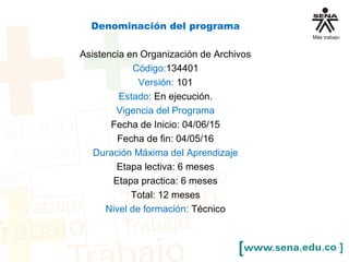 Este documento presenta un programa de formación técnica en Asistencia en Organización de Archivos de 12 meses de duración. El programa busca brindar capacitación en organización documental y tecnologías de la información a aprendices para que puedan trabajar en empresas públicas y privadas que prestan servicios archivísticos. El programa desarrollará competencias en producción de documentos, servicio al cliente, comprensión de inglés, tramitación y organización de archivos de acuerdo a la normatividad vigente.