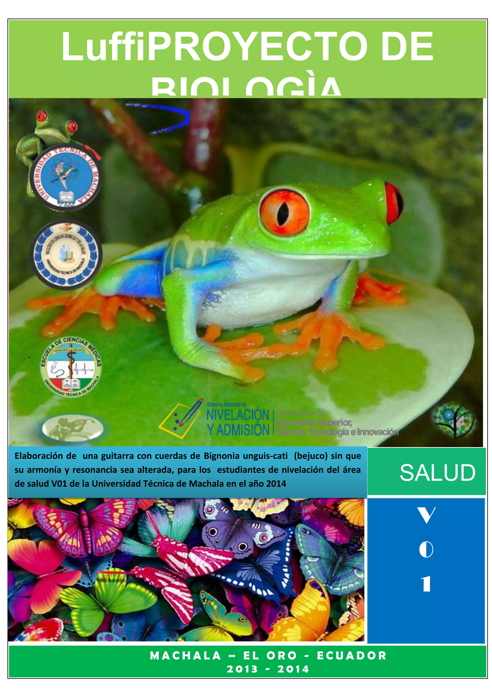 Este documento presenta un proyecto para elaborar una guitarra con cuerdas de bejuco (Bignonia unguis-cati) para los estudiantes de nivelación de salud de la Universidad Técnica de Machala en 2014. El proyecto busca innovar en los materiales utilizados para las cuerdas sin alterar la armonía del instrumento. Incluye agradecimientos, una dedicatoria y un índice de contenidos del proyecto.