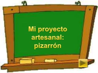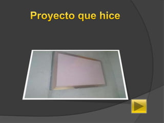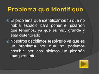 El documento describe el proceso de crear un nuevo pizarrón más pequeño. Identificaron que su pizarrón actual era demasiado grande y estaba dañado, por lo que no había espacio para él. Decidieron hacer un prototipo de pizarrón más pequeño usando madera, pintura y acetato debido a que la pintura especial era cara. Aunque los resultados no fueron los esperados, su prototipo sirvió para mostrar cómo debería ser su nuevo pizarrón, el cual beneficiará a la clase al permitirles escribir.