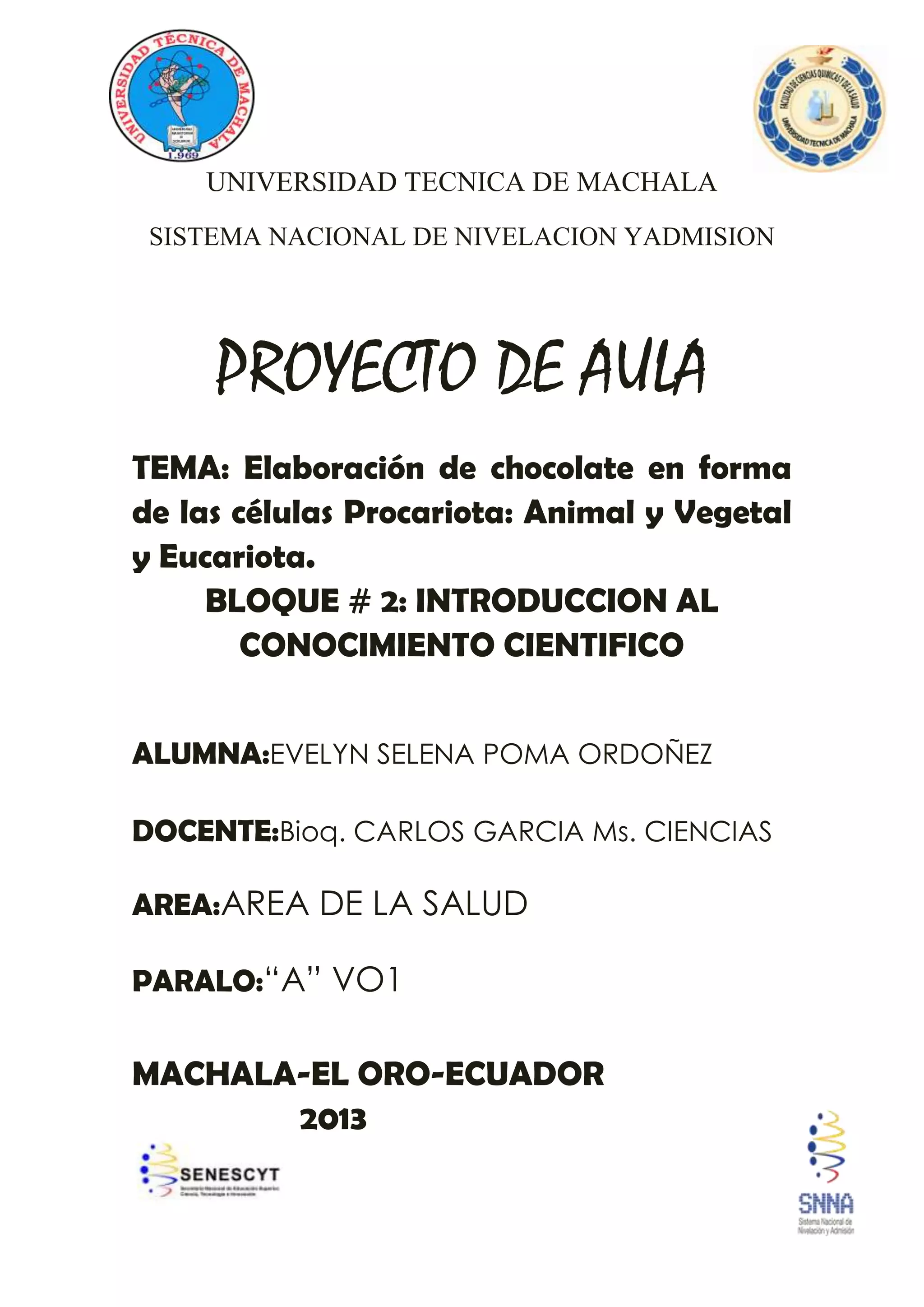 Este documento describe el proceso de elaboración de chocolate en forma de células procariotas y eucariotas. Explica brevemente la taxonomía y orígenes del cacao, las variedades principales (criollo, forastero y trinitario), y sus usos comerciales. El objetivo es elaborar chocolate de manera natural para facilitar el aprendizaje sobre las partes básicas de las células a través de un postre.