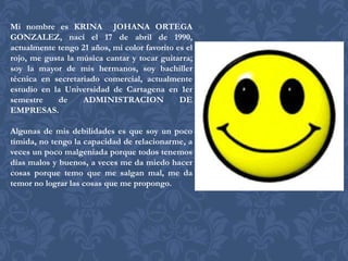 Krina Johana Ortega González es una mujer de 21 años que estudia Administración de Empresas en la Universidad de Cartagena. Sus fortalezas incluyen su habilidad para resolver problemas, ser trabajadora y estudiosa. Sus metas a corto plazo incluyen pasar sus semestres universitarios con buenas calificaciones y cuidar bien de su hija, y a largo plazo desea tener su propia casa, empresa y brindar empleos.