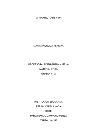 El documento presenta el proyecto de vida de María Angélica Pereira, una estudiante de 16 años. Ella describe su familia y objetivos, incluyendo su sueño de convertirse en psicóloga y especializarse en psiquiatría y sexología. También analiza sus fortalezas como ser honesta y comprometida, así como sus debilidades como ser directa y reservada. Concluye que un proyecto de vida proporciona un rumbo y constancia para alcanzar éxitos duraderos.