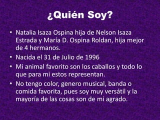 Natalia Isaza Ospina es una joven de 21 años que disfruta de los caballos y los deportes. Su proyecto de vida involucra servir a la sociedad como médica o piloto. Para lograr sus objetivos, planea estudiar medicina o aviación en universidades en Colombia o en el extranjero, y completar pasantías e intercambios para adquirir experiencia. Su enfoque es aprovechar sus 5 próximos años de estudio para prepararse para ayudar a otros de la mejor manera posible.