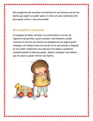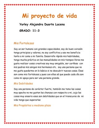 El documento presenta el proyecto de vida de Yurley Alejandra Duarte Lucena. Describe sus fortalezas como ser humano con capacidades y buen corazón, sus principios y valores, y habilidades manuales. También expone sus debilidades como su carácter fuerte y tomarse las cosas muy en serio. Sus propósitos a mediano plazo incluyen terminar el bachillerato con honores y pasar el examen ICFES con buenos resultados para entrar a la universidad. Sus metas a largo plazo comprenden estudiar ingeniería de