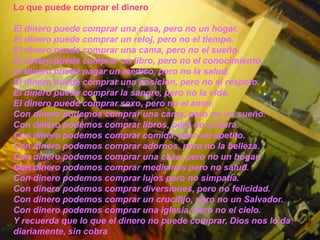 El documento contrasta lo que el dinero puede y no puede comprar, señalando que aunque el dinero puede adquirir cosas materiales, no puede comprar cosas intangibles más valiosas como el amor, la felicidad, la salud y el respeto. Además, menciona que Dios nos da diariamente cosas que el dinero no puede comprar.