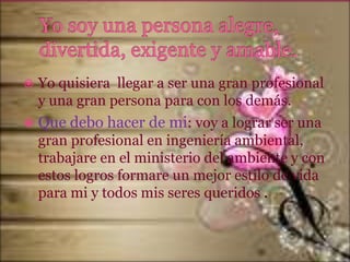 La persona desea convertirse en una gran profesional en ingeniería ambiental y trabajar para el ministerio del ambiente, con el fin de proteger el medio ambiente y mejorar su estilo de vida y el de sus seres queridos. Reconoce algunos defectos como ser orgullosa e impaciente, y sus sueños incluyen terminar la universidad, tener una carrera exitosa y formar una familia.