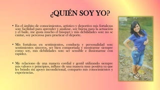 Este documento presenta el proyecto de vida de Lissette Chacón Ponce. Ella se describe a sí misma como alguien con fortalezas en el aprendizaje, la actuación y el baloncesto, pero debilidades en el canto y la falta de práctica deportiva. Sus metas incluyen graduarse como ingeniera en contabilidad y auditoría, formar una familia y ayudar a otros a alcanzar sus metas a través de sus conocimientos. Ella también identifica valores como la humildad, el respeto y la confianza como importantes para sus relaciones familia