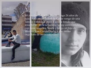 Este documento presenta el proyecto de vida de Carlos Duchi, un estudiante de 24 años. Carlos describe su familia, personalidad, fortalezas, debilidades y aspiraciones. Sus metas a corto plazo incluyen trabajar para mantener a su familia y aprobar el curso de nivelación con buenas notas. A mediano plazo, planea continuar estudiando en la universidad y establecer un negocio. A largo plazo, desea terminar su carrera universitaria, expandir su negocio y viajar con su familia. Su