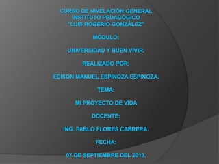 Edison Manuel presenta su proyecto de vida, en el cual detalla sus fortalezas y debilidades, sus aspiraciones educativas y profesionales de convertirse en ingeniero mecánico automotriz. Explica sus objetivos como estudiante y profesional a corto, mediano y largo plazo, los cuales incluyen obtener un título universitario, adquirir conocimientos sobre su profesión, e independizarse formando una familia.